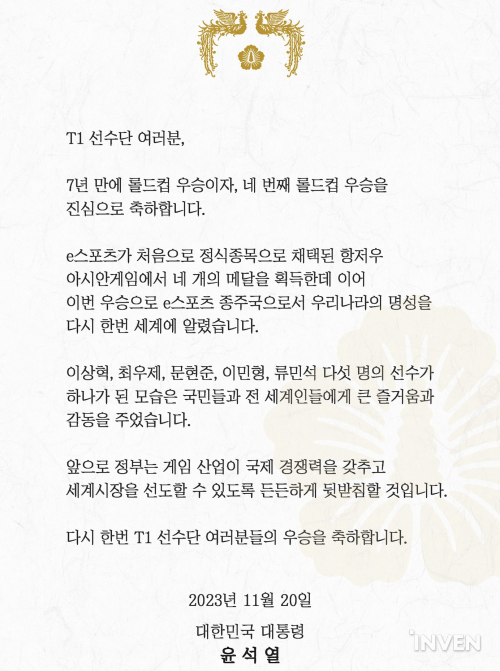 20일 윤석열 대통령은 SNS를 통해 “7년 만에 롤드컵 우승이자, 네 번째 롤드컵 우승을 진심으로 축하한다”라며 “이번 우승으로 e스포츠 종주국으로서 우리나라의 명성을 다시 한번 세계에 알렸다”라고 전했다. 이어 “앞으로도 정부는 게임 산업이 국제 경쟁력을 갖추고 세계시장을 선도할 수 있도록 든든하게 뒷받침할 것이다”라고 덧붙였다.