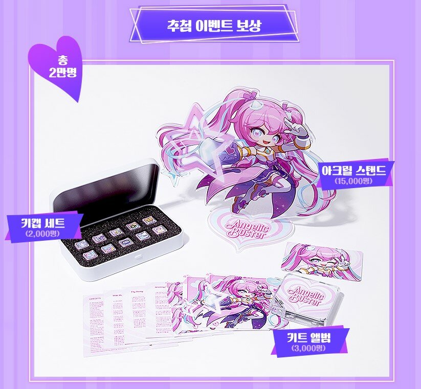 같은 기간, 레벨 범위 몬스터 1,000마리 처치 후 출석을 완료한 ‘엔젤릭버스터’ 이용자에게 ‘쁘띠에스카다 펫 패키지’, ‘엔젤릭버스터 컴백 의상 세트 교환권’, ‘슈퍼스타 헤어/성형 쿠폰 상자’ 등의 치장 아이템을 선물한다. 10회 출석을 완료한 이용자에게는 굿즈 추첨 이벤트에 응모 가능한 ‘엔젤릭버스터 컴백 굿즈 응모권’을 지급한다. 또, 추첨을 통해 약 2만명에게 ‘엔젤릭버스터 아크릴스탠드’, ‘키캡 세트’, ‘키노 키트’ 중 1종을 증정하는 굿즈 추첨 이벤트를 진행한다.