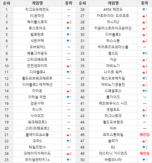한편, 서든어택의 경우 전주 대비 사용시간이 4% 하락했음에도 불구하고 4위로 한 단계 순위가 상승했으며, 메이플스토리 또한 엔젤릭버스터 리마스터 및 각종 이벤트를 통해 사용 시간 증가와 순위 상승 모두를 거머쥐었습니다. 한편, 로스트아크는 전주 대비 PC방 사용시간이 약 25% 가량 감소하며 3계단 하락한 7위에 안착하게 되었습니다.